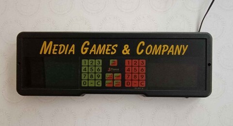 SEGNAPUNTI IN RADICA USATO PLAY 6 della Favero. Sottile e robusto segnapunti dalla grafica sobria adattabile ovunque. Utilizzabile per pool, snooker, internazionale, 5 birilli e anche per il ping-pong. Ultra-flat: spessore di 4 cm - altezza 19,5 centimetri - 56 centimetri di lunghezza. Numeri 60 millimetri di altezza, rossi e verdi come i tasti corrispondenti di comando. Tastiera a membrana, con tasti grandi chiaramente leggibili, che rendono la tastiera facile da usare e piacevole da guardare. Sigillato contro polvere e fumo. Vita minima di ogni tasto: cinque milioni di tocchi. in caso di black-out, nessun punteggio in memoria viene perduto, e tutto cio senza luso di batterie. Viene fornito con cavo e spina, ma puo essere aperto facilmente sul retro per un eventuale collegamento diretto. Il consumo di energia Trascurabile: 6VA max a 220V . garanzia come per legge, manuale di istruzioni. Peso kg. 2,5. C