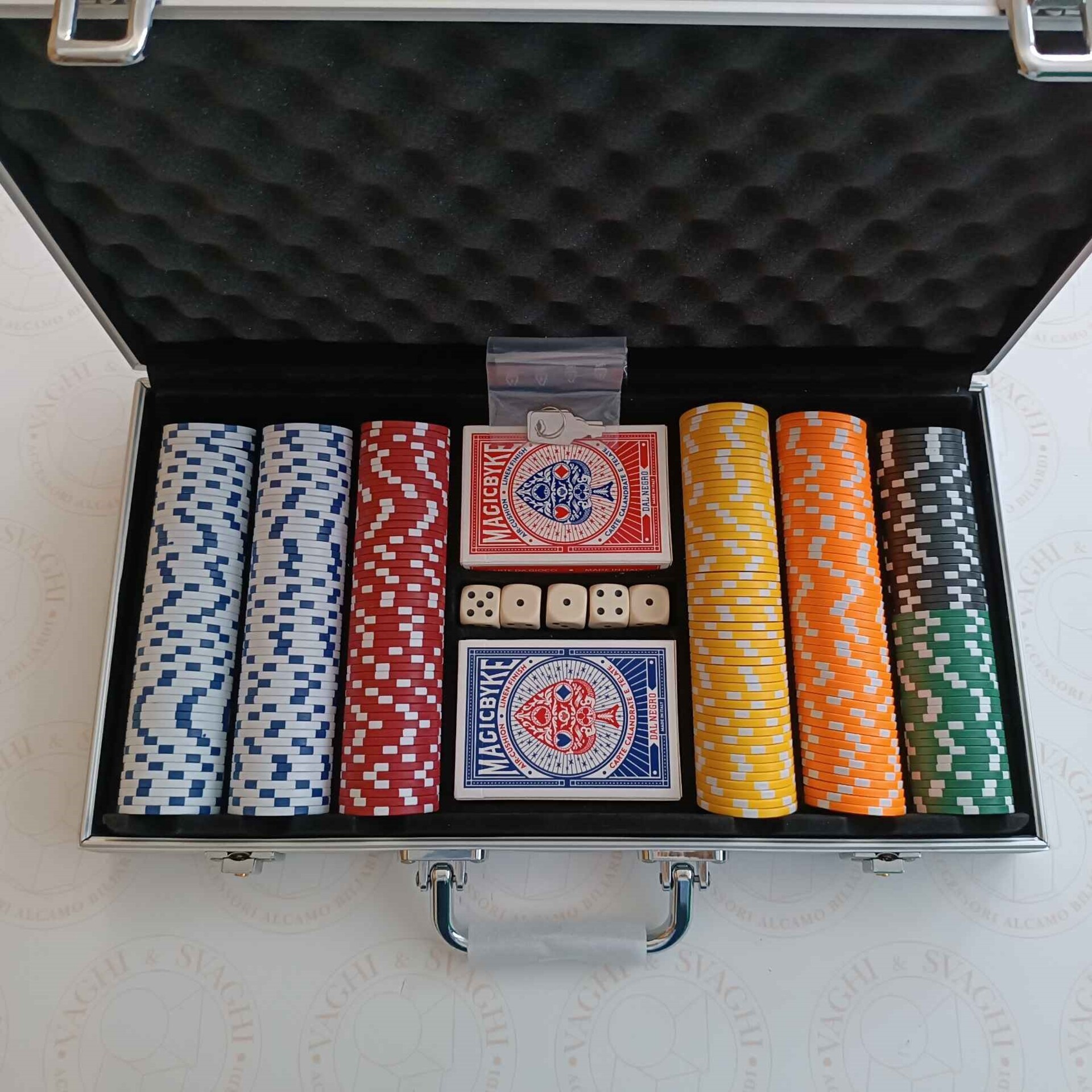 300 Fiches, 2 mazzi da poker Magic Byke, 5 dadi comuni avorio, 2 chiavi per serratura.