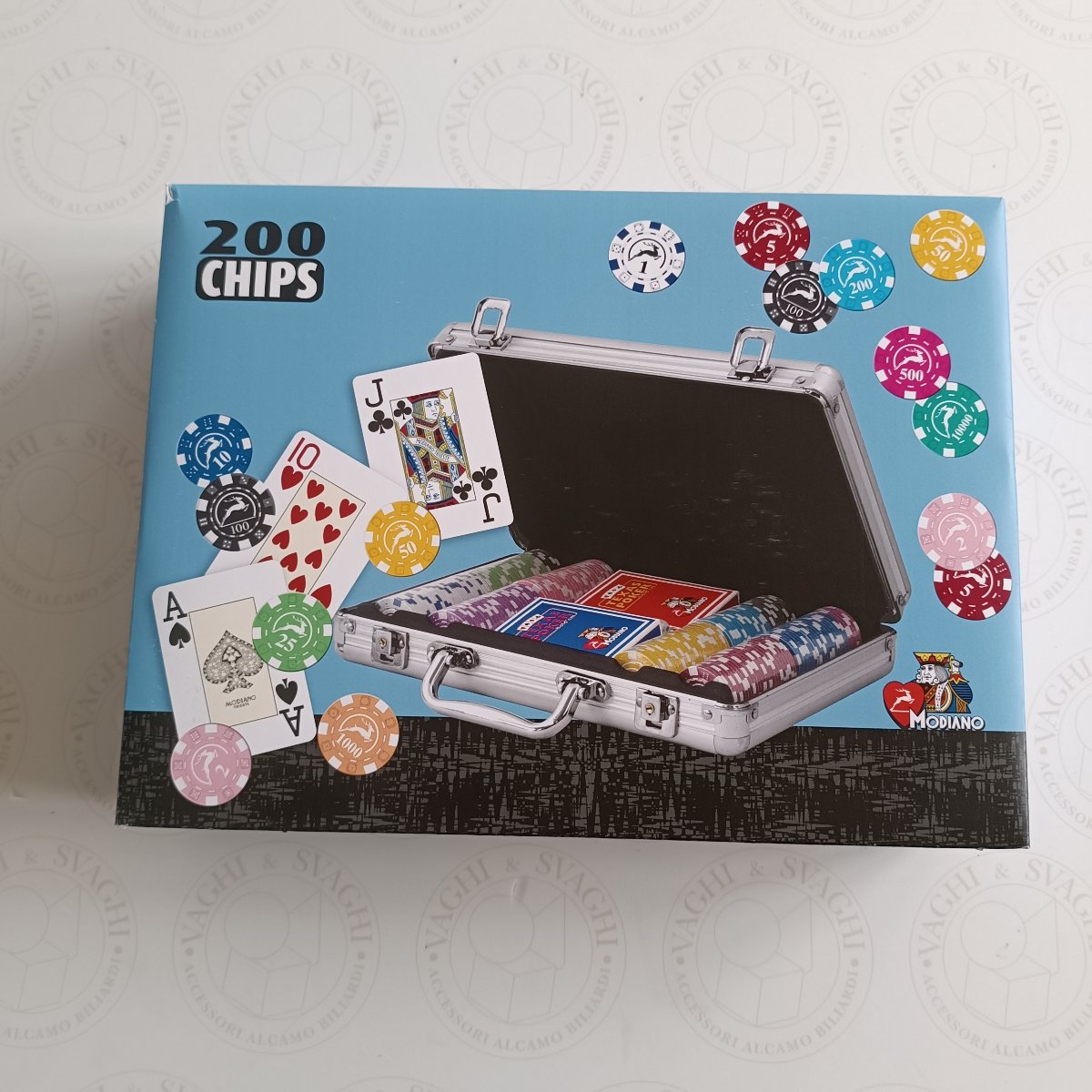 Contenuto confezione: 200 Fiches, 2 mazzi da poker Texas, 5 dadi comuni rossi, 1 dealer, 2 chiavi sicurezza valigetta
